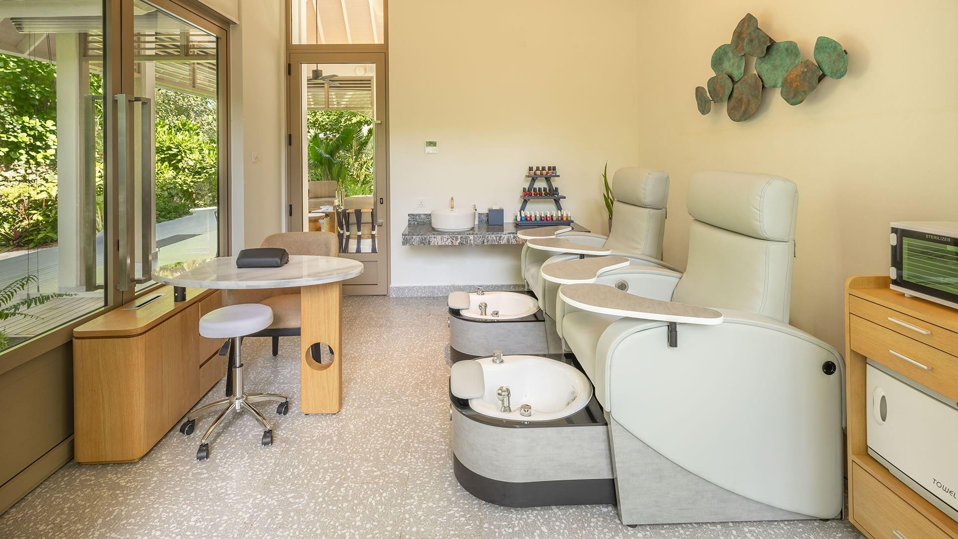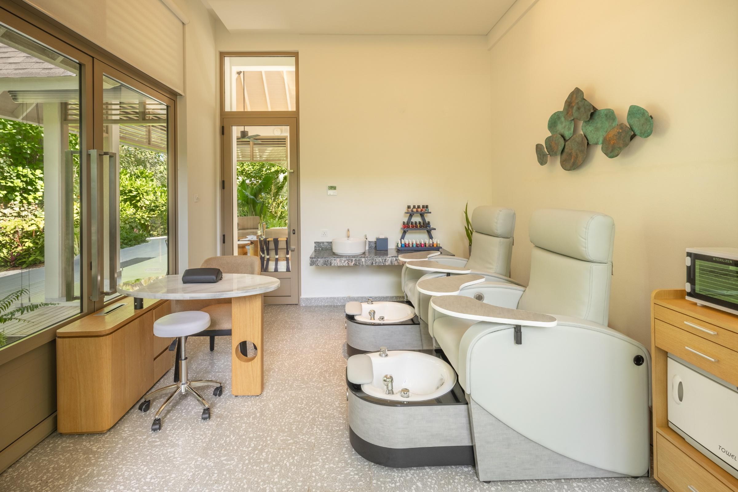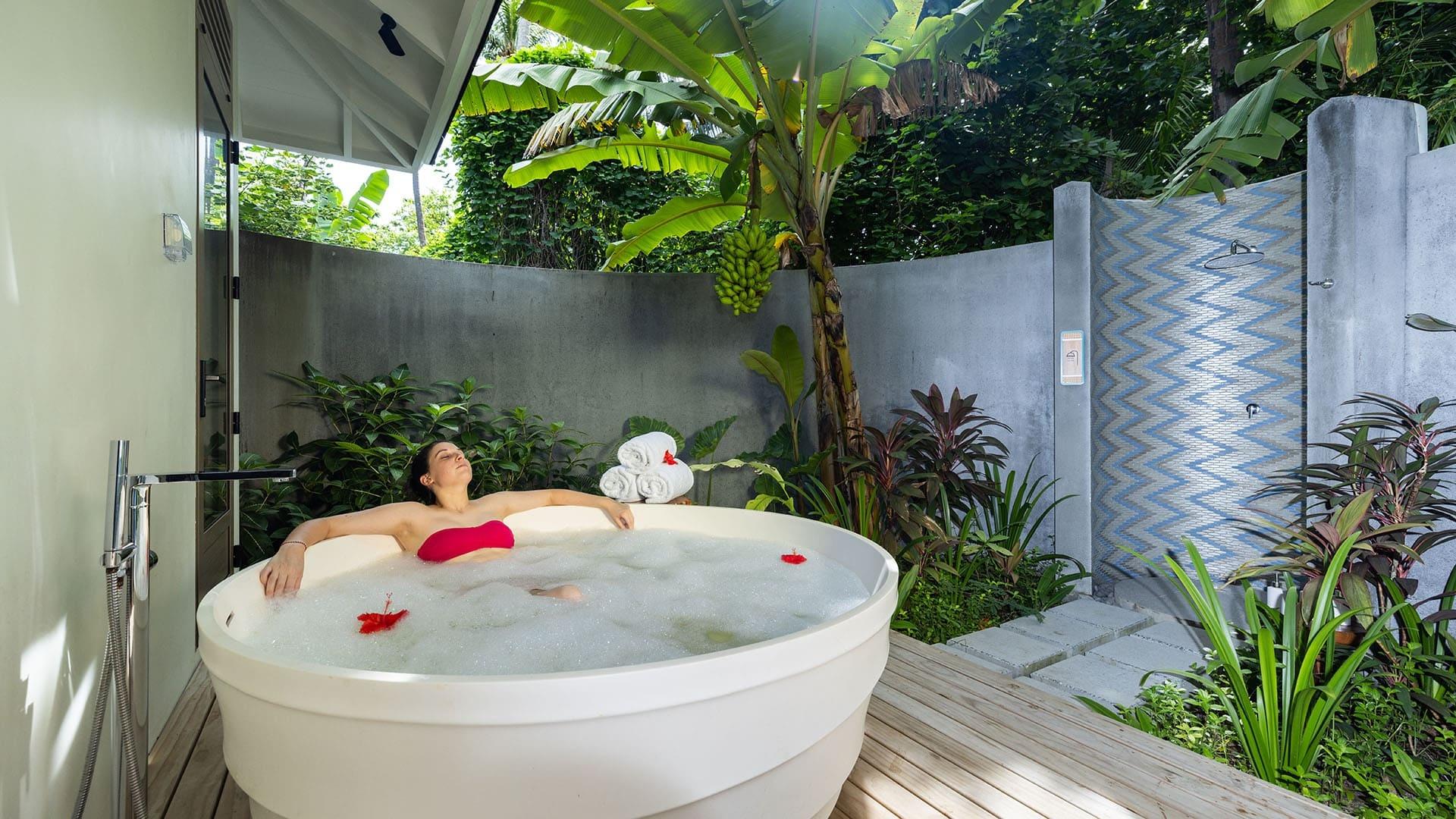 Zur Standardausstattung zählen komfortable Betten mit hochwertiger Bettwäsche, eine individuell regulierbare Klimaanlage, Deckenventilator, Smart-TV mit Chromecast, Bluetooth-Lautsprecher, eine Minibar, ein Safe sowie eine Tee- und Nespresso-Kaffee-Station. Die offenen Bäder verfügen über eine freistehende Badewanne, eine separate Regendusche sowie – in einigen Kategorien – eine Outdoor-Dusche unter freiem Himmel.