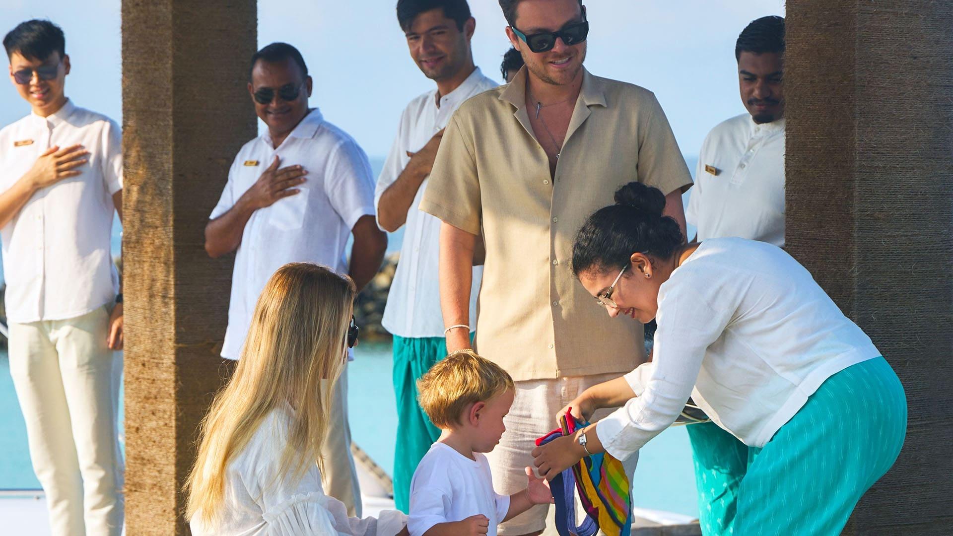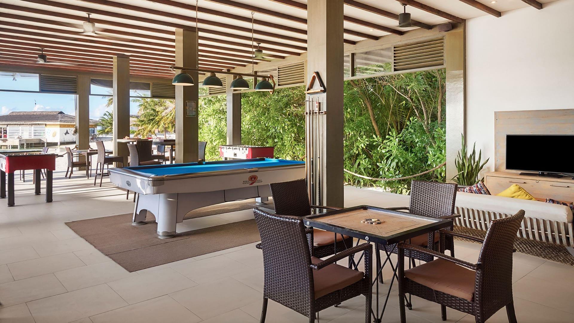 Sportlich stehen Schnorcheln, Tauchen, Jetski, Kajak, Windsurfen, Stand-up-Paddling und Kitesurfen zur Verfügung. Der Fitnessbereich bietet moderne Geräte, dazu Yoga im Pavillon sowie Meditationsstunden. Das preisgekrönte Overwater-Spa verfügt über sieben Behandlungsräume, einen Beauty Salon, eine Relax-Lounge und bietet Anwendungen mit balinesischen und ayurvedischen Einflüssen auf Basis von Phytomer-Produkten. Für Familien gibt es den Kids Club „Little Explorers“ mit Indoor- und Outdoor-Angeboten sowie Babysitting. Zur weiteren Ausstattung zählen ein Infinity-Pool mit Jacuzzi und Kinderbereich, eine Bibliothek, eine TV-Lounge, Brettspiele und ein Marine Sports Centre. Nachhaltigkeitsinitiativen umfassen Solarstrom, Recycling und eine eigene Wasserabfüllanlage.